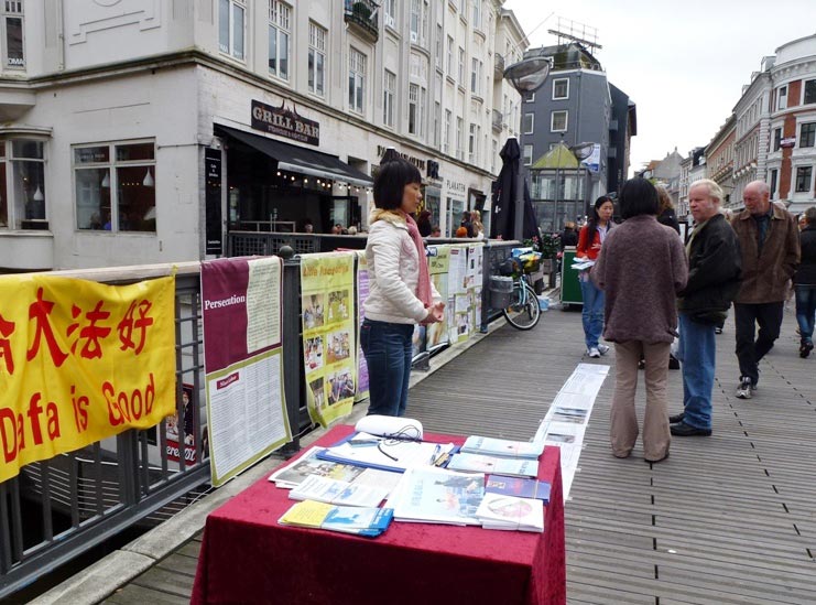 九月八日,法轮功学员在热闹繁华的奥尔胡斯市中心步行街上挂起“法轮大法好”的横幅,介绍大法弘传世界各地的条幅以及揭露中共迫害法轮功的图片,向民众讲述法轮大法的美好和中共迫害法轮功的真相。