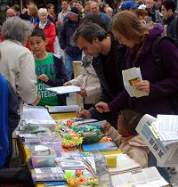 在众多的摆满了新鲜蔬果和各式食品的摊位中,法轮功的摊位别具一格。在悠扬的炼功音乐中,人们看到这种舒缓的炼功,纷纷驻步在摊位前。不少的有缘人纷纷想知道,他们在哪儿可以学到这种功法。有一位女士,很久就知道法轮功,但是却无缘看到炼功点,也没有接触到炼功的学员,今天她在农夫市场看到了法轮功学员的炼功,她十分地兴奋,连连说,“没想到今天这么幸运,无意中得到了自己很想知道的东西。”她要求学员写下联系的方式,和炼功的地点,并在摊位停留了很久,希望了解更多的信息。