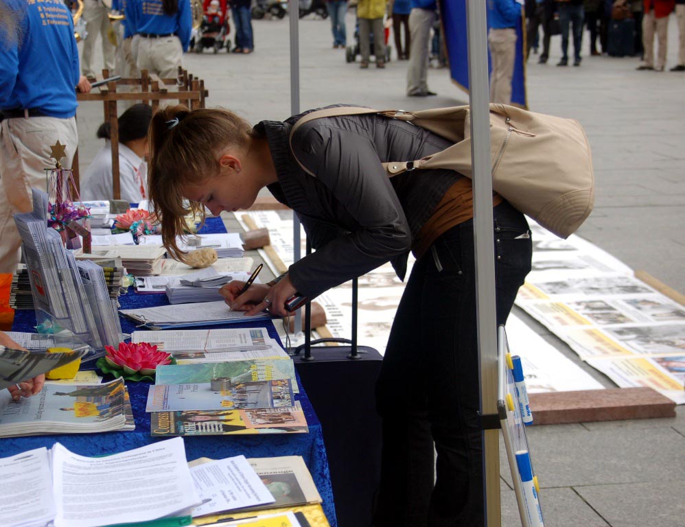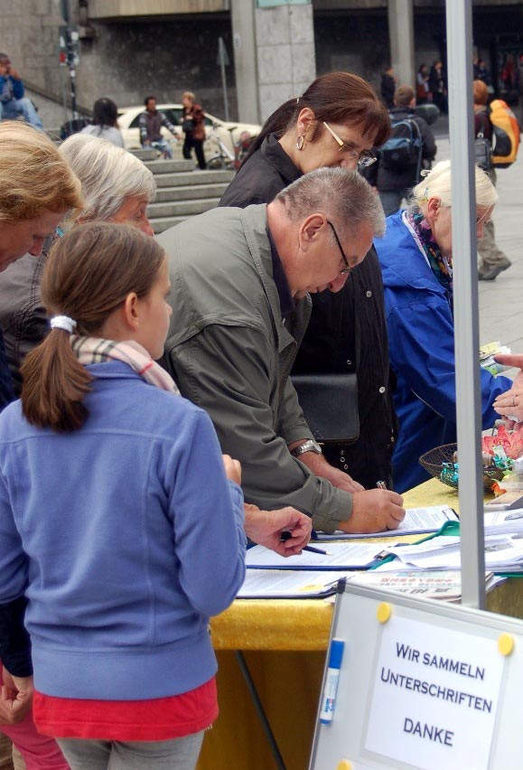 面对来来往往的人流,法轮功学员们散发着真相传单。不少明白了真相的德国人纷纷签名支持停止当前还在发生的迫害。有一个德国人看到了停止迫害法轮功的横幅,连连点头称是,然后径直走向征集签名的展位,当场签下了自己的名字。同时也有不少参加中国节,或来科隆旅游的华人也停下了匆匆的脚步,或看着展板,或直接和学员交谈,再也不是前几年受中共谎言蒙蔽大家都绕道走的样子了。当天有近三十个中国人办了三退(退党团队)。