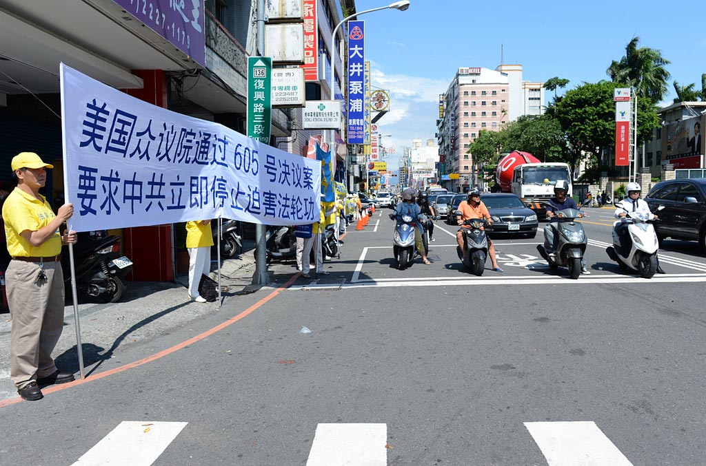 车队一出左营站,迎面而来的是巨大横幅“法轮大法好”、“停止迫害法轮功”、“法办江泽民 罗干 刘京 周永康!”伴随洪大的声浪:“法轮大法好、停止迫害法轮功”,令整个车队惊慌往垦丁方向离去。这“停止迫害”的声浪触动着现场每一位路人和媒体摄影机的聚焦,有群众还提醒法轮功学员“陈来了来了,开始喊”,“走了走了,休息了”。