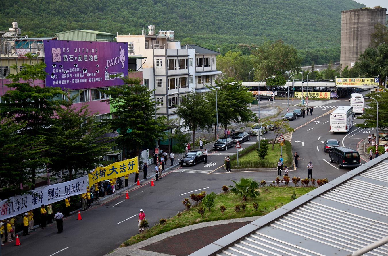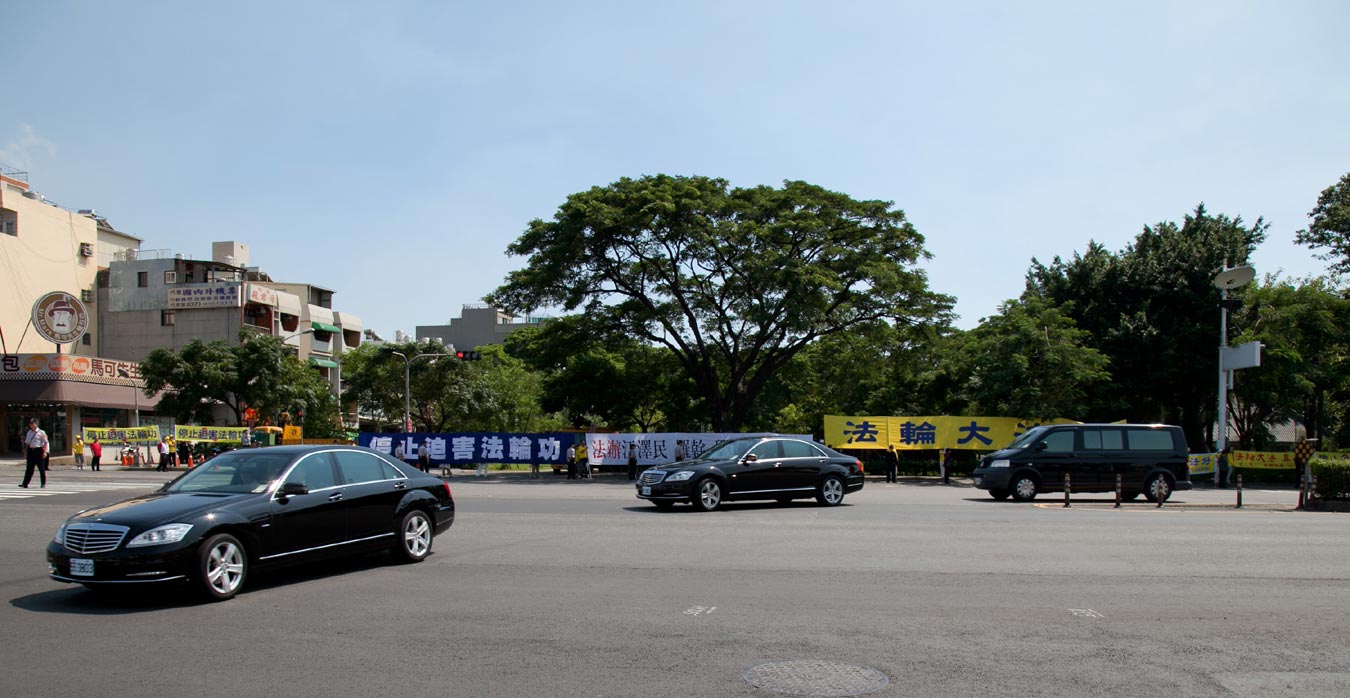 ![]() 陈云林车队(右前)一出左营站,迎面而来的是巨大横幅伴随洪大的声浪:“法轮大法好、停止迫害法轮功” |