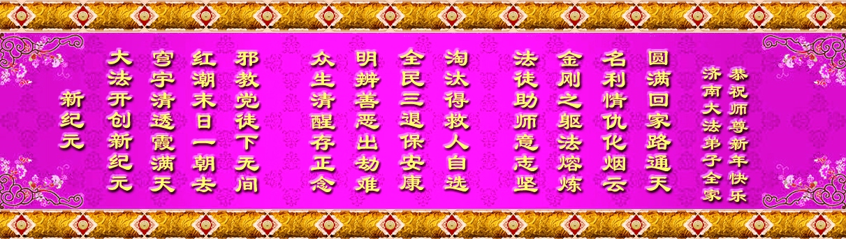 在新的一年里,我们整体要协调的更好,更加精進的做好三件事,多救人,让师父多一分欣慰,少一分操劳。全体大法弟子诚挚的向师父说一句:“师父辛苦了,谢谢师父的慈悲苦度。”