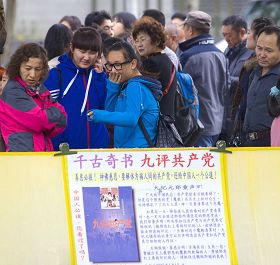 大陆观光客驻足观看法轮大法弘传世界图片展