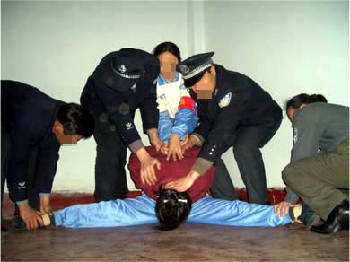 ![]() 酷刑演示:抻床(把法轮功学员的手和脚分铐在床上梁和床腿抻) |