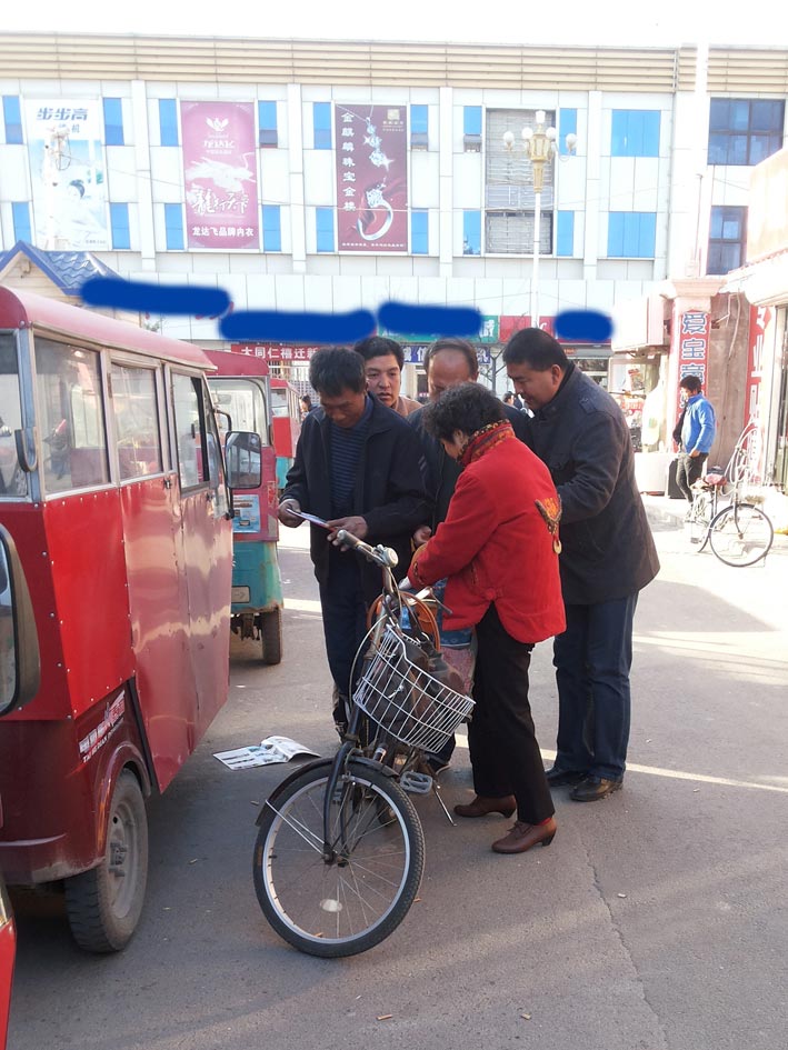 前几年城市处于建设扩建时期,到处是工程,到处修建公路,到处建厂房,到处建居民楼,除了当地民工外,还吸引了大量的外地务工人员。我就天天骑着三轮车,带着成箱的资料,大的《九评》书加上各种内容的期刊册子,各类真相光碟等,穿梭于这些工地。每到一处工地,资料很快就发完,有时人太多,几乎就是在抢。有一次我到修外环公路的工地,路宽沟深,干活的人也多。我就在路基面上给人发光盘,很快被抢光了。就在我骑上车子要走时,只见一在沟底干活的男子,提着铁锹就上来了,掉了一只鞋子也不顾的穿,大声嚷嚷着不让我走,说:我一直在喊着要,你给他们,为什么不给我。直到我一再答应再给他送时,才让我走。