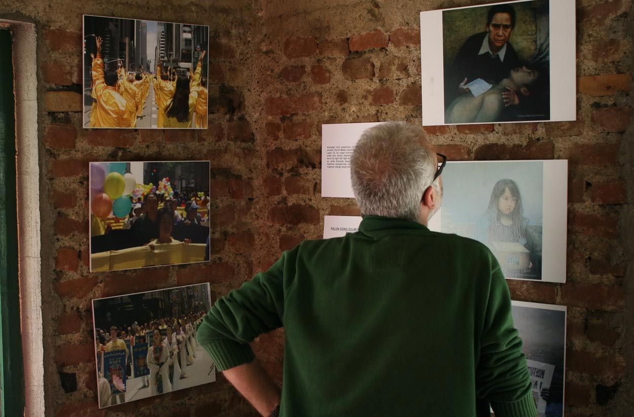 土耳其迪亚巴克市的玛雅咖啡屋展厅里,参观者聚精会神地观赏每一幅法轮功真相图片