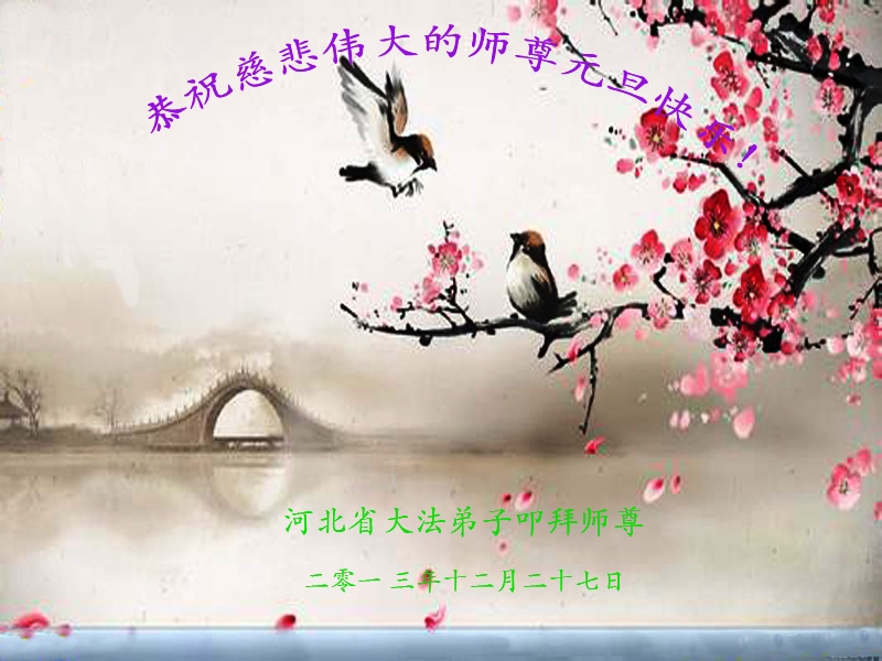 师尊好!时间飞逝,转眼進入新的一年,我们非常想念师尊!祝师尊新年快乐!能成为大法弟子,我们感到非常荣耀和幸福,我们不忘自己的使命,每天讲真相救众生,努力做好三件事。彼此沟通、互相配合、共同精進,圆满随师还。
