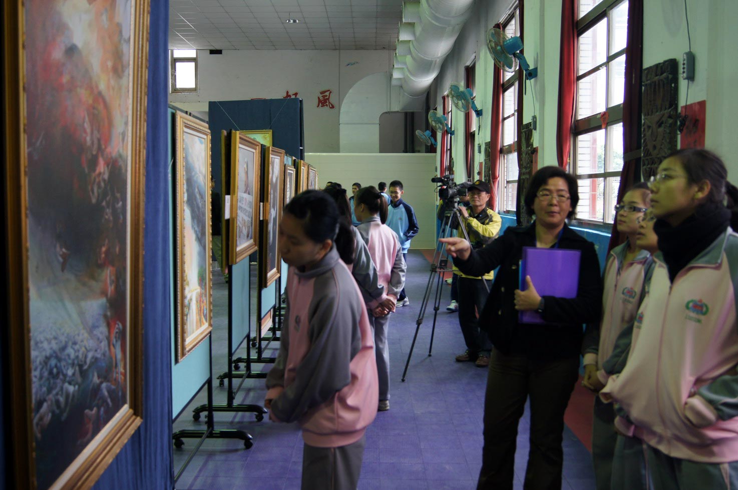 ![]() 学生观赏真善忍美展画作 |