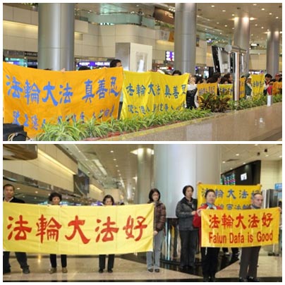 法轮功学员在机场拉横幅反迫害,要中共立即停止迫害法轮功