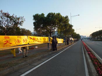 法轮功学员在台中科学园区前,持横幅“法轮大法好”,向中共代表喊话