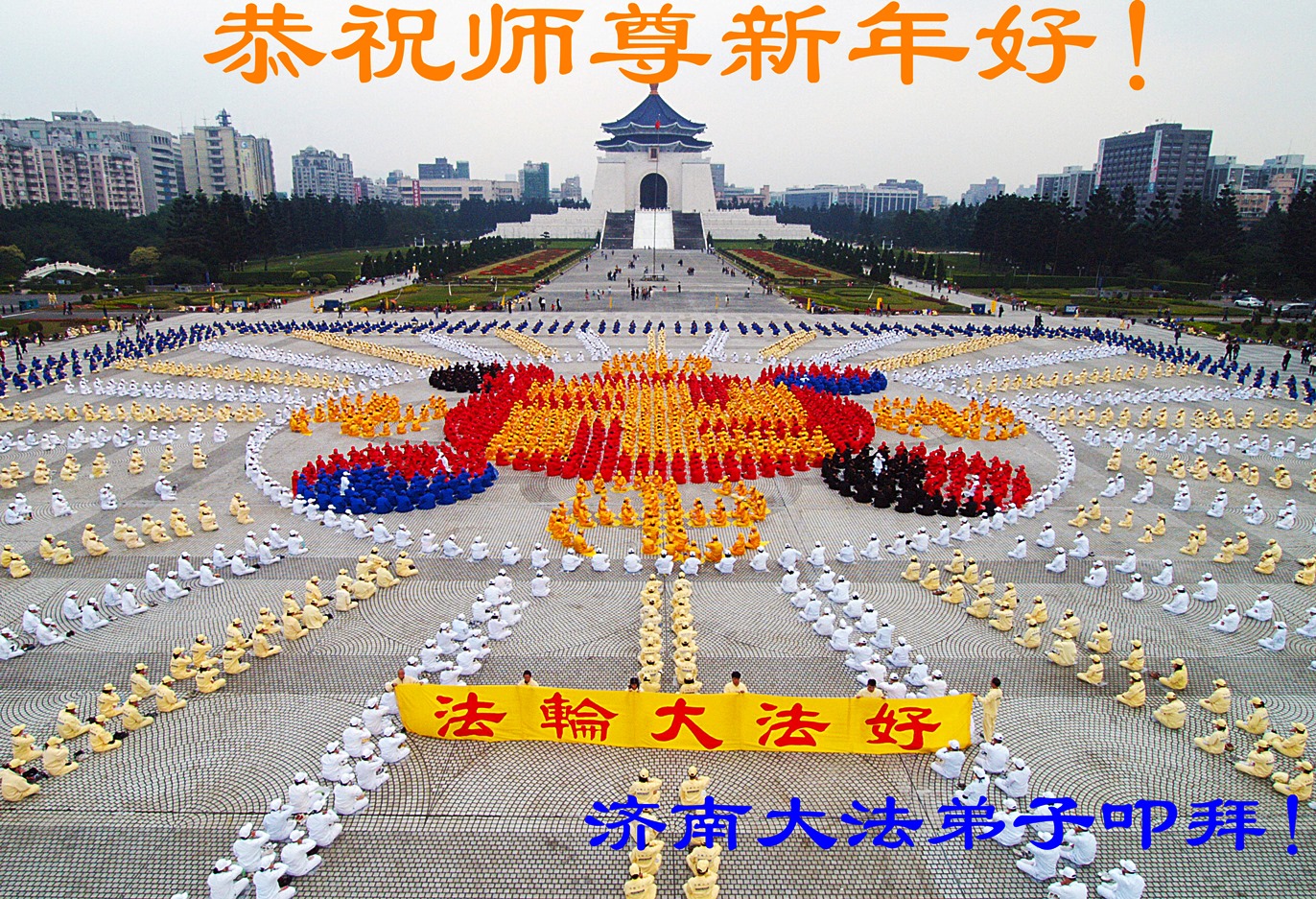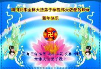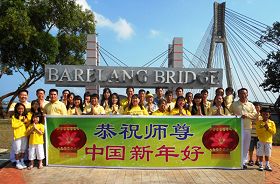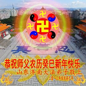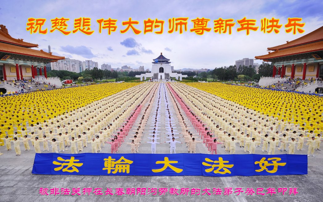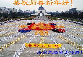 台湾中区五县市(台中县、台中市、彰化、南投、云林)大法弟子经过三天二夜的集体学法交流后,全体学员向伟大的师尊拜年,“恭祝师尊新年快乐”。
