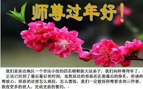 希望同修们在过年期间除了做好三件事之外,还要加大力度发正念。原定的发正念内容和每晚的八点到八点半全大连市发正念时间不变,其余时间自己安排。不要错过每一次整体配合的机会。