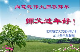 北京海淀区大法弟子向慈悲伟大的师尊拜年,恭祝师尊新年快乐!2013年癸巳年新年来临之际,北京海淀区大法弟子向慈悲伟大的师尊拜年,恭祝师尊新年快乐! 师父过年好!弟子想念师父,盼师尊早日回大陆。