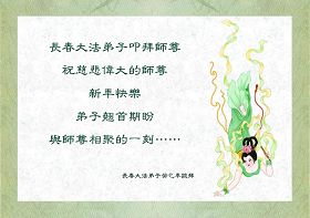 全体新加坡大法弟子向师父拜年:恭祝师尊新年好!台湾大法弟子恭祝师父新年快乐!台湾大法弟子恭祝伟大师尊新年快乐!颂师恩旧宇更新迎新宇,宇宙生命同化法。