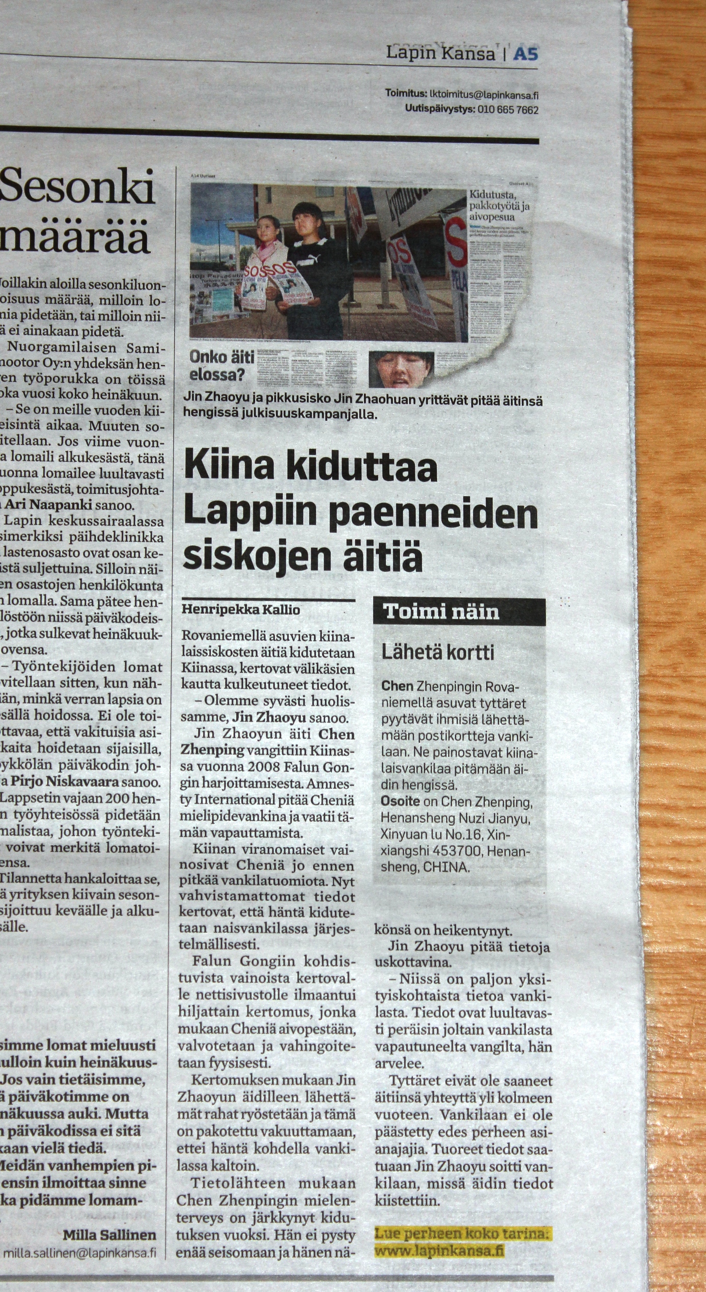 芬兰拉普兰省报曾经在二零零九年和二零一二年两次报导陈真萍因为修炼法轮功而遭受中共迫害。今年二月十一日,芬兰拉普兰省报又再次采访了陈真萍在芬兰的大女儿金昭宇。