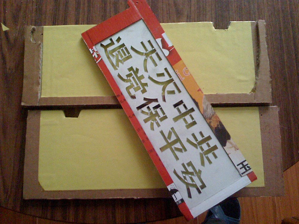 一、 在word里‘页面布局’栏,页面方向选‘横向’(打横字时),页边距选‘适中’,纸张选A4,然后选‘插入’,选‘艺术字’,选‘空心字’,打上要刻的字,选择粗(B)、正体(I)、字体选‘黑体或宋体’,然后在word里用鼠标点中周边出现八个小圆圈,把鼠标放在右下角斜着拉动鼠标就可放大图片到合适大小。裁下贴在塑料模板上,用刻刀把字刻下来,注意字中空的地方不要刻,如中字那两个口请看图。