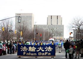 为庆祝爱尔兰传统节日“圣派翠克日”(St. Patrick’s Day),二零一三年三月十六日,爱尔兰社区在加拿大首都渥太华举办了大型游行庆典。由八十多位法轮功学员组成的“天国乐团”是三十九个游行队伍中规模最大的乐队。