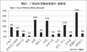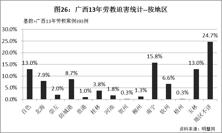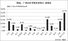 图26统计结果表明,南宁地区受到劳教迫害的比例最高,其次是百色和玉林。但因为中共的消息封锁,仍有24.7%被劳教的法轮功学员所属地区不详。