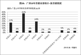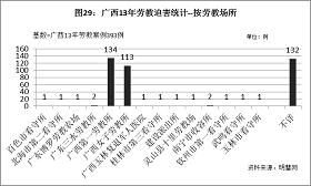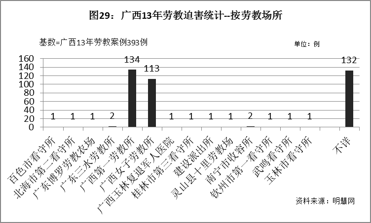 图29统计结果显示,广西当局对被劳教的法轮功学员主要采取集中关押的管理方式。男性法轮功学员主要被送往广西第一劳教所劳教,女性法轮功学员主要送往广西女子劳教所劳教。