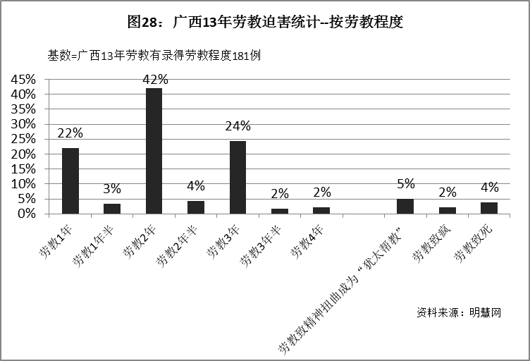 在393例劳教案例中,有181例有受害者被劳教年数的记录。图28对这些案例的统计分析显示,在被劳教的法轮功学员中,被劳教2年的最多,占42%,然后是劳教1年和劳教3年。甚至还有劳教4年的。
