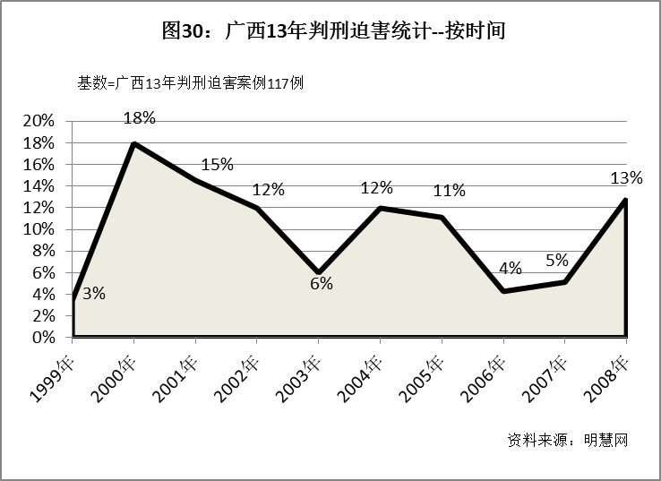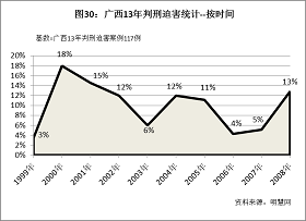 图30数据表明,判刑作为迫害法轮功的一种“法律”手段,经历了三个波峰,其中2000年是第一个判刑迫害高峰,也是最高峰,随后逐年降低;在2004年和2005年形成第二个判刑迫害高峰,2008年又突然出现第三个判刑迫害高峰,之后明慧网就没有记录到广西当地相关的判刑案例。