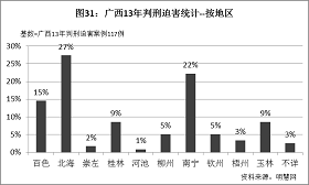 图31显示,如果按照地区统计,北海法轮功学员被判刑最多,占28%,然后南宁,占22%,然后百色,占15%。