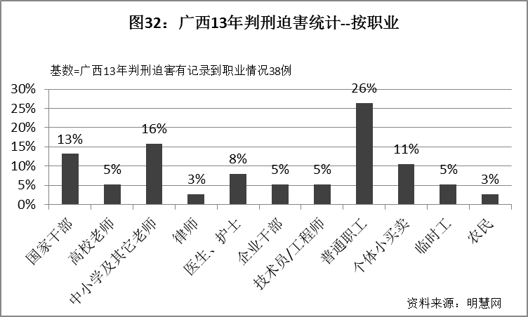 图32结果显示,在被判刑的法轮功学员中,普通职工比例最高,占26%,其次是中小学老师,占16%,高校老师被迫害的比例也有5%,国家干部占13%,个体小买卖占11%,医生护士占8%,企业干部、技术员、临时工各占5%,律师和农民也有3%。