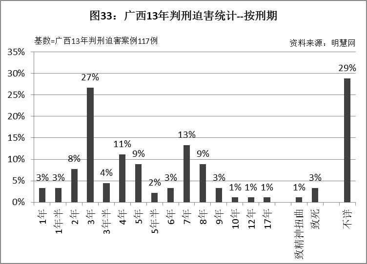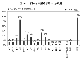 图33结果显示,在被判有期徒刑的广西法轮功学员中,被判3年的最多,占27%,其次是7年13%,4年11%,5年9%;甚至有被判10年、12年、17年的。判3年及以上刑期的占86%。判刑致死率达3%。