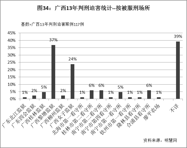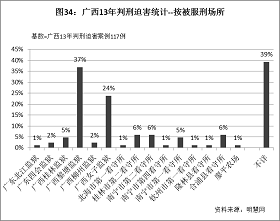 图34统计结果表明,广西黎塘监狱与广西女子监狱是广西当局关押法轮功学员的主要监狱,其中37%的法轮功学员被关押在广西黎塘监狱,排第一,24%的法轮功学员被关押在广西女子监狱,排第二。