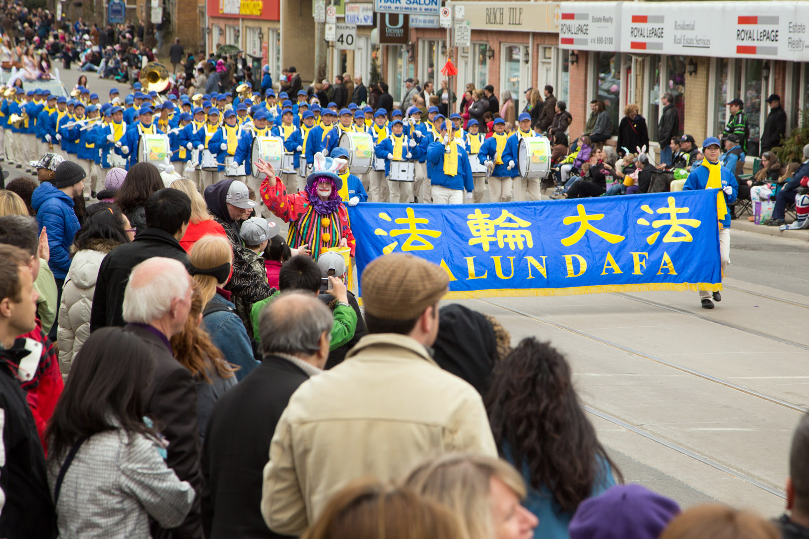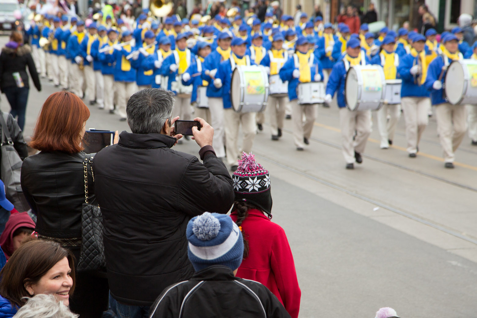 多伦多居民凯瑟琳•爱德华兹(Catherine Edwards)和波德瑞(Bordieri)一起观看游行。爱德华兹称赞天国乐团纪律很好,并指着腰鼓队说:“这个很漂亮,很平和,这证明加拿大是一个热爱自由的国家,可以很开放的庆祝人们的文化和信仰,非常好。”