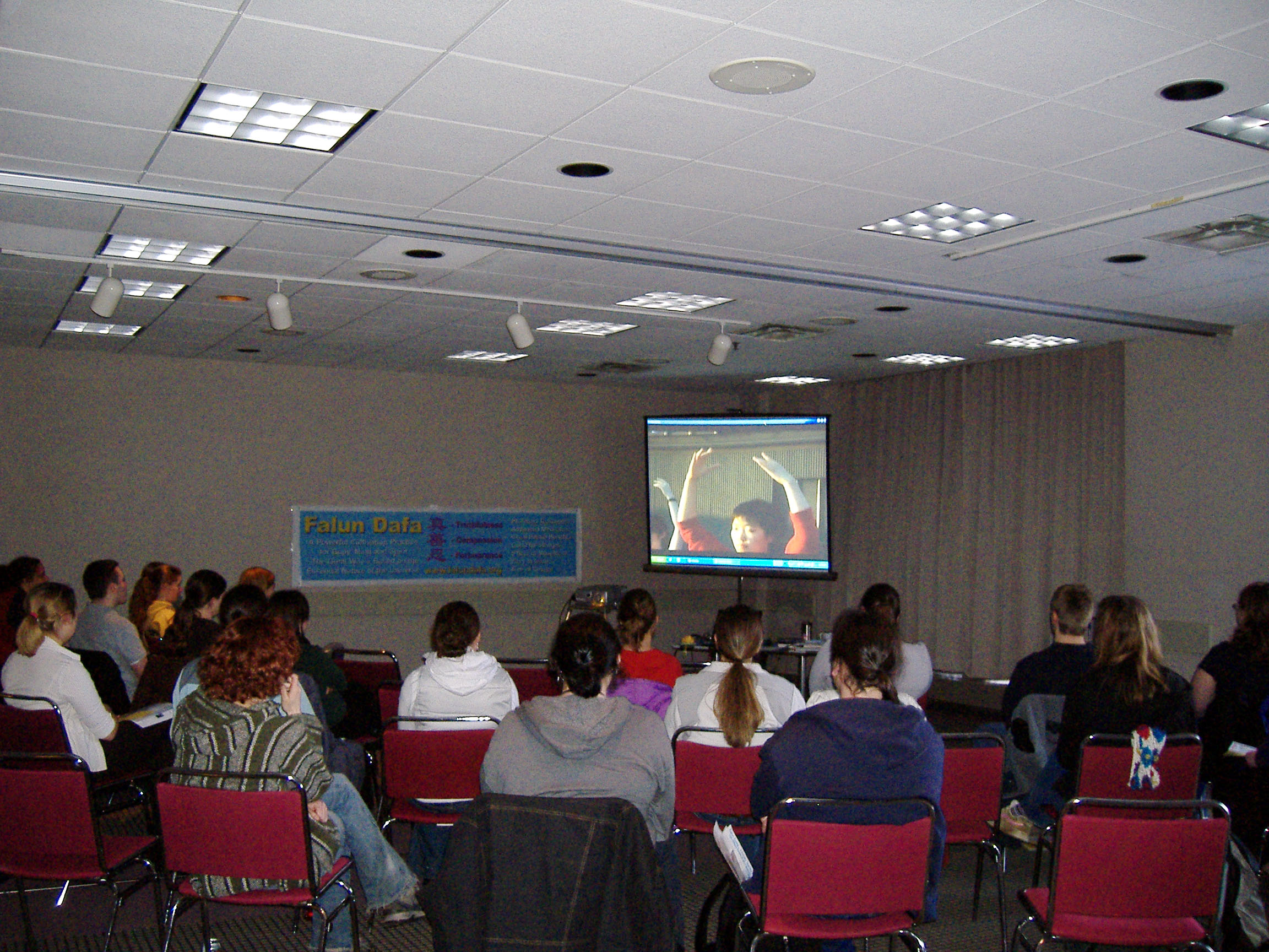 参加真相讲座的师生们在观看介绍影片