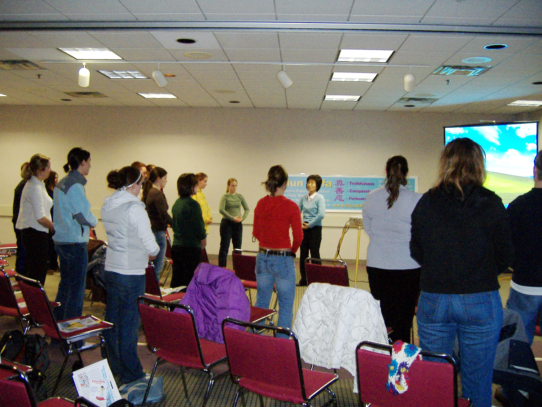 讲座开始时先向师生们介绍什么是法轮功,以及法轮功的弘传情况;然后,开始学炼五套功法,祥和而舒缓的动作,加上炼功音乐,都会让师生们非常感兴趣;在对法轮功有了基本了解后,学员为大家讲解迫害法轮功的真相,并播放真相纪录片,特别是中共活摘法轮功学员器官的血腥罪恶,短短的几个小时之内,善与恶的强烈对比,给这里的师生们留下了深刻的印象,他们都表示会到白宫网站请愿书上签名,要求美国政府关注中共活摘法轮功学员器官的暴行;或表示通过自己的网络社交网,把真相再传播广一些;有些观众表示自己曾经在华盛顿DC等大城市看到过大法的活动,能在这里再次看到如此详尽的真相,很难得,对于法轮功学员遭受的非法迫害,心里非常难受;有些观众表示要和自己认识的组织或地方政府联系,请法轮功学员到更多的地方举办讲座,传播真相。有的观众表示看到过校园里征签的海报,已经到白宫网站上签名了。