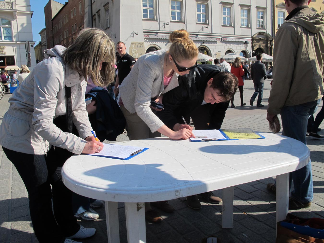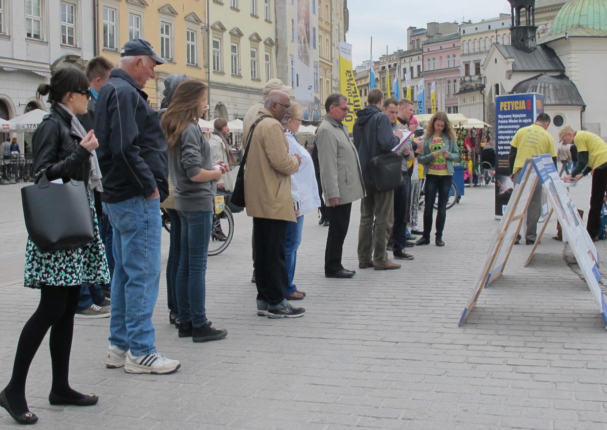 当天下午与周日下午,法轮功学员来到克拉科夫古城中心广场,支起展板和征签台,向过往游人介绍法轮功真相,吸引了大量观众驻足观看。展板上令人震惊的事实,使人们纷纷在征签簿上签名强烈谴责和反对活摘法轮功学员器官的罪恶行径、立即停止这种邪恶迫害。在六个小时中,有六百六十多名明真相游客参加了征签。