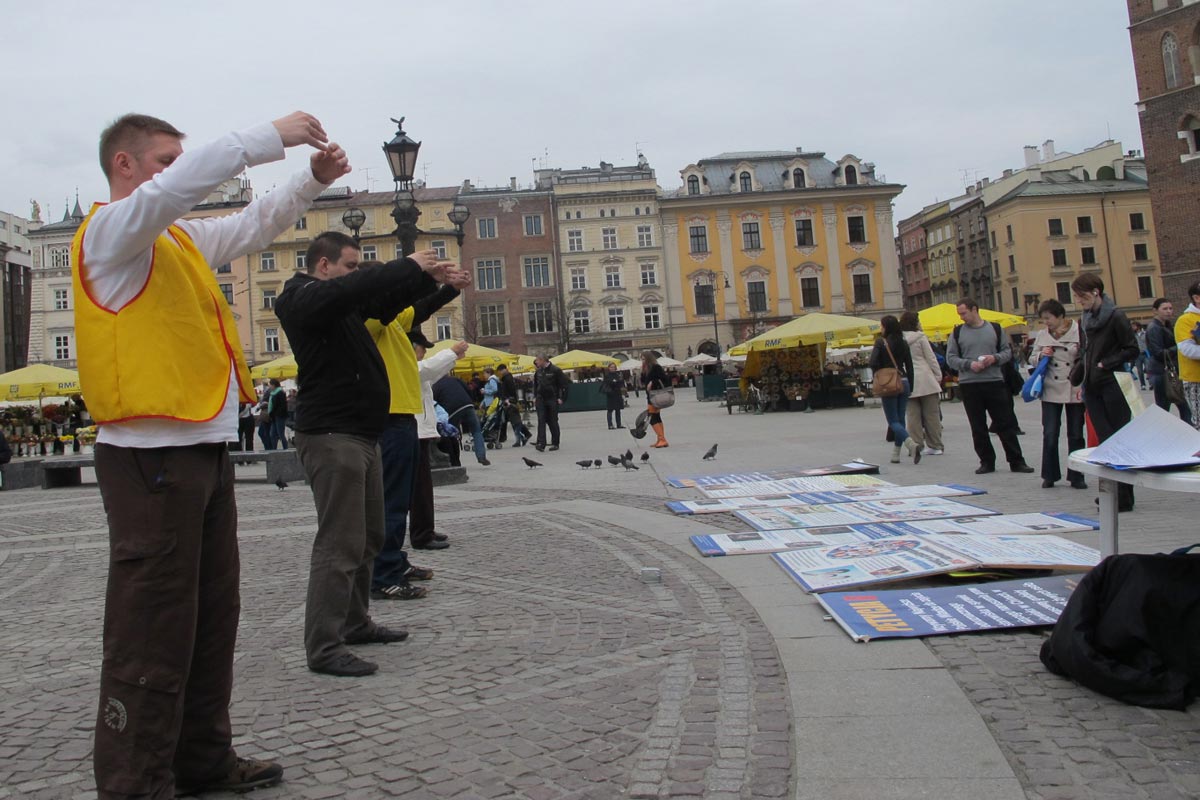 ![]() 法轮功学员在克拉科夫市古城中心广场向民众展示法轮功功法 |