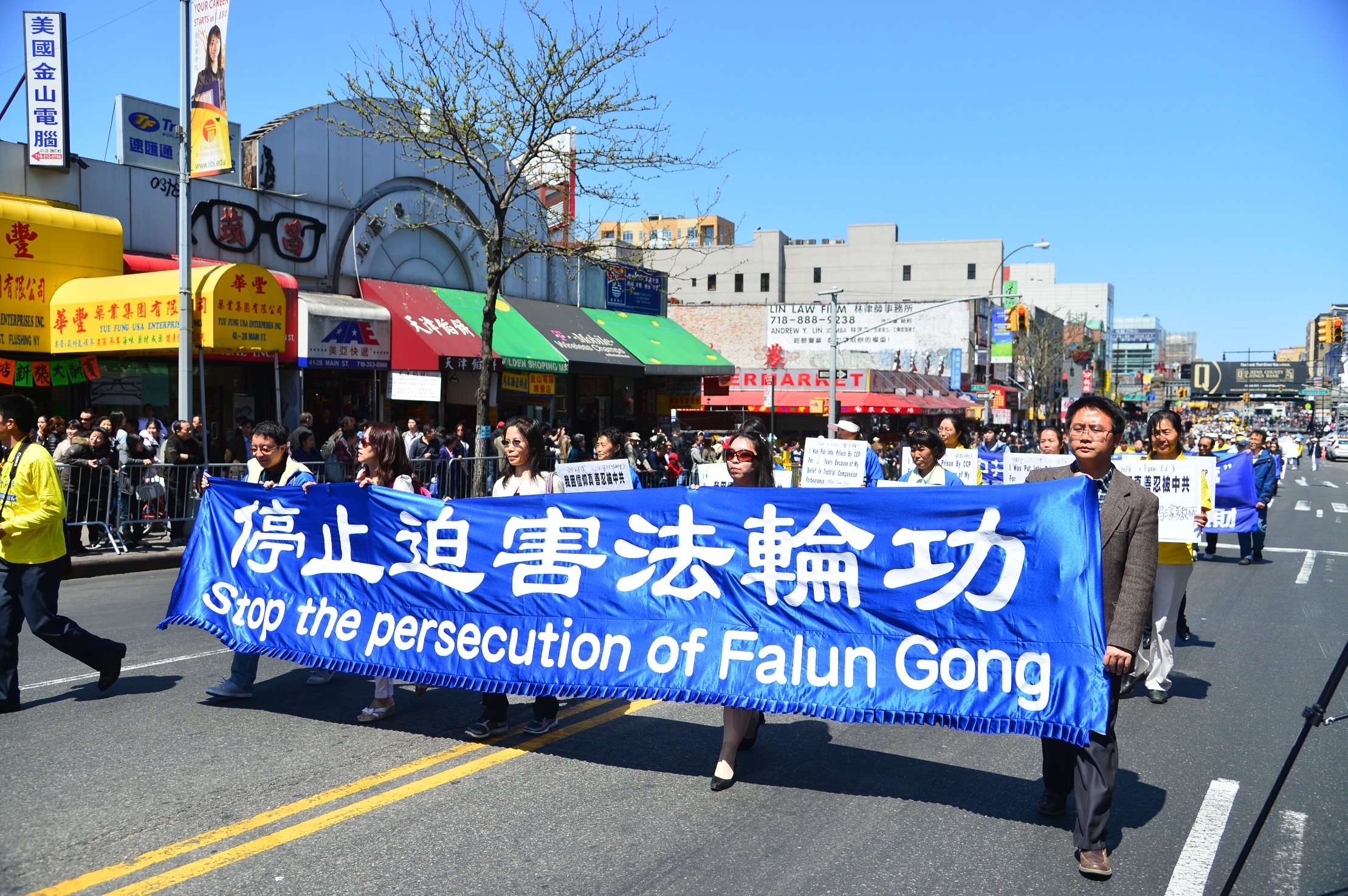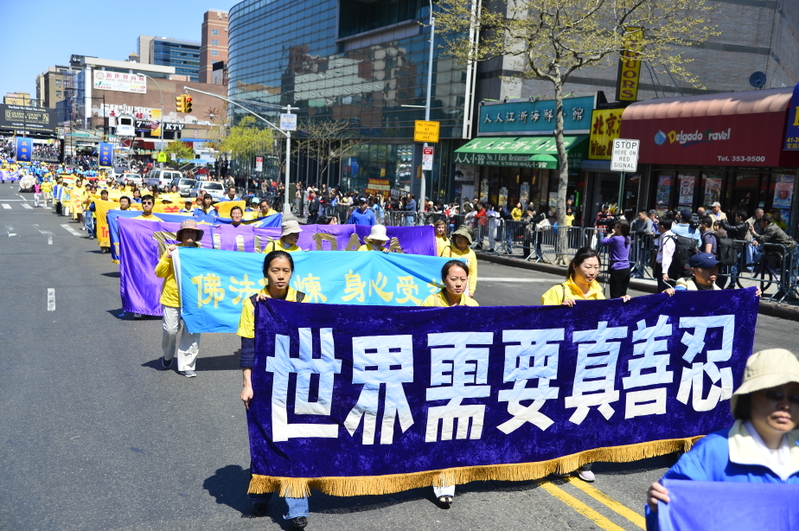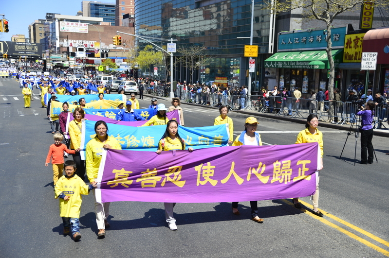 灿烂的春日阳光下,摩肩接踵的法拉盛街头挤满了观看游行的华人。多年来坚持不懈的讲真相,华人们已经从不解、害怕到接收和钦佩。人们纷纷拿出ipad, iphone,照相机留下这珍贵的时刻。法拉盛大游行再次秉承了“四二五”和平理性坚持真理的精神,讲述着中共十四年并持续至今的残暴迫害,更展示了法轮佛法的美好慈悲和威严。