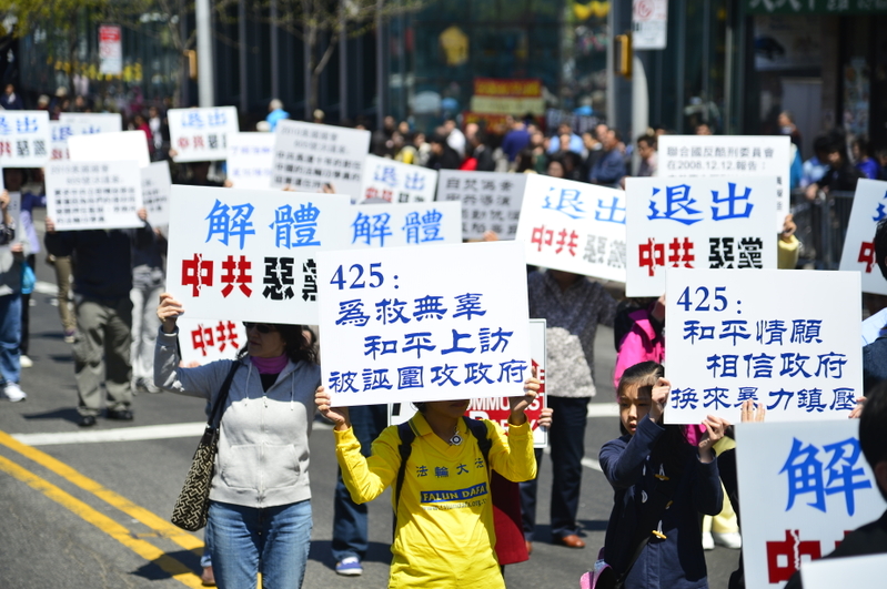 游行之后,法轮功学员再次来到法拉盛的凯塞娜大道上,举行盛大集会,呼吁解体中共,结束迫害。集会现场,法轮功发言人张而平、全球退党服务中心代表李大勇、曾在马三家劳教所遭受迫害的法轮功学员、反强摘器官医生协会发言人戴蒙博士(Dr. Damon)、新唐人电视台时事评论员李天笑博士、法拉盛四十选区领导人玛莎(Martha Flores-Vazques)女士等众多嘉宾发言,纪念四二五和平上访,声援反迫害十四周年,祝贺一亿三千六百万中国民众公开退出中共党团队。