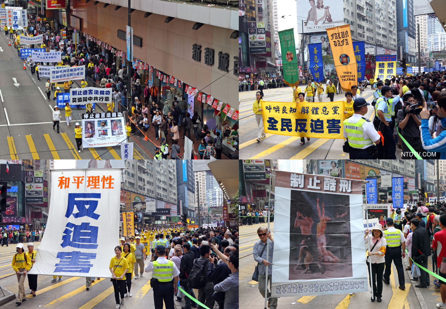 反迫害集会于下午二时结束后,紧接着数百名法轮功学员的遊行队伍由英皇道遊乐场出发。身着蓝白相间唐装、气势雄伟的天国乐团,一路吹奏 《法轮大法好》、《法鼓法号震十方》、《法正乾坤》、《送宝》、《佛恩圣乐》、《法轮圣王》等多首正气浩然的军乐,一路带领遊行队伍,穿越港岛闹市主要街道,遊行队伍经过沿途,吸引道路两侧的广大民众以及遊客围观。