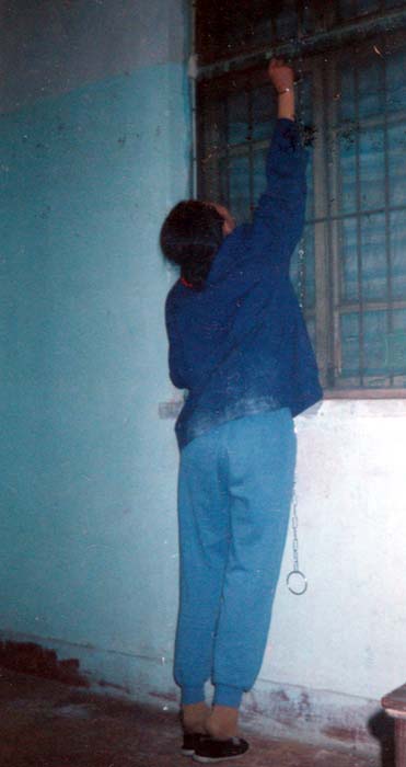 六月九日,我不配合邪恶,不穿犯人穿的黄马甲,包号女恶警和邪恶的副所长,给我强行戴上背铐,把两只手套在一个环内,从上午七点铐到晚上八点。只因铐的太紧了,致使我全身疼痛抽筋,疼得我死去活来。两只手肿起,呈黑紫色。二零零八年十月十五日,上级来看守所检查,恶警安排,让说干活没任务,馍随便吃。我不配合恶警说谎。结果,又被邪恶戴上背铐,我又经历一次非人的折磨,那个痛苦的情况与上次没有区别。