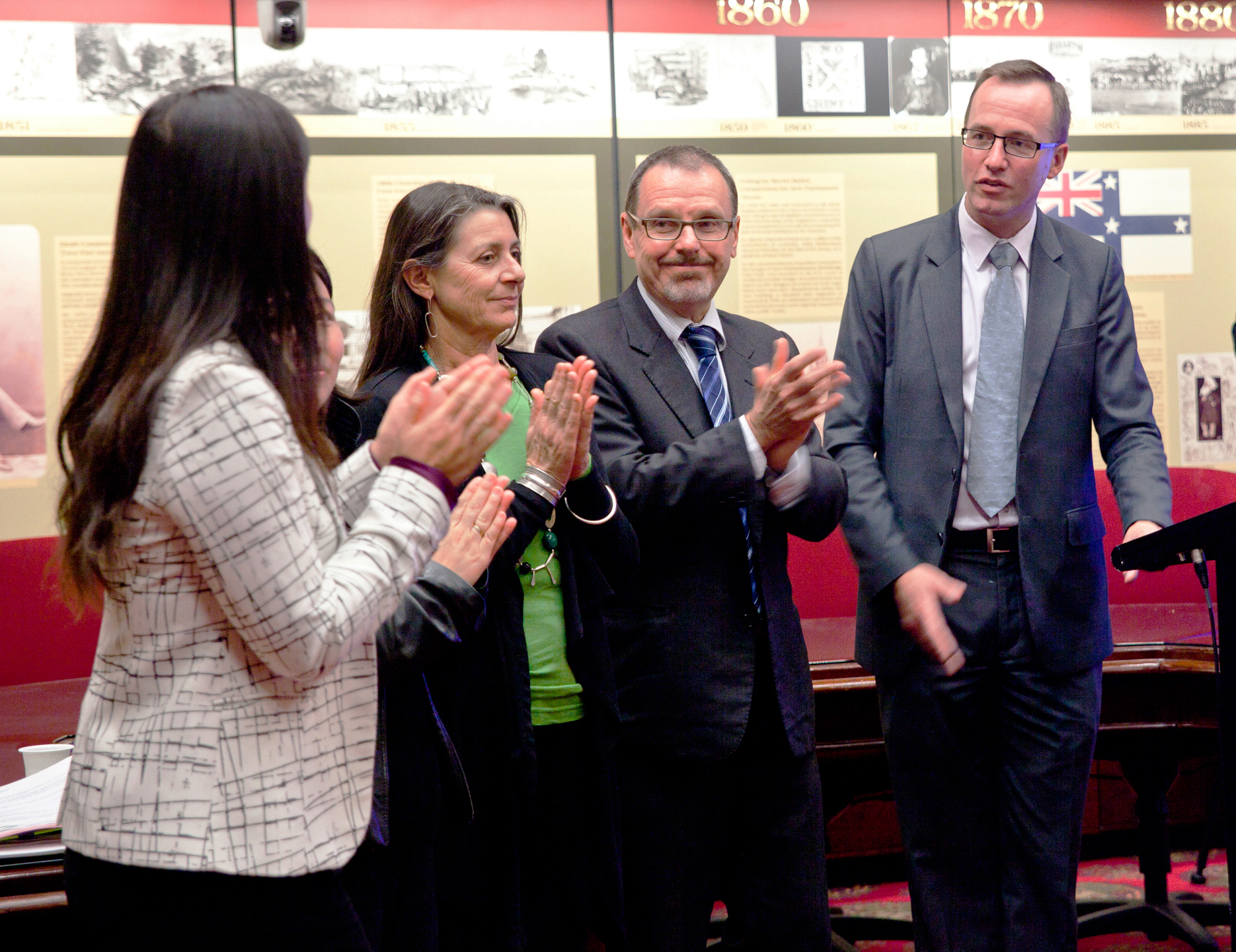 ![]() 绿党议员大卫•舒布瑞杰(David Shoebridge右一)、约翰•凯(John Kay右二)和简•巴勒姆(Jan Barham右三)一道,向议会递交了超过十万份澳洲市民签名的请愿书,这是新州有史以来收到的签名人数最多的请愿书 |