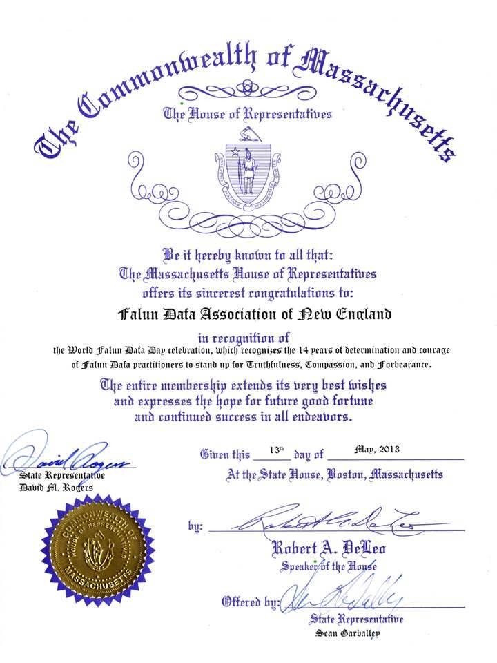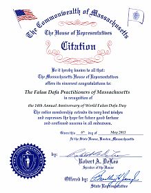 【明慧网二零一三年五月十日】日前,美国麻州参众州议员颁发褒奖信,褒奖麻州法轮大法学员十四年来捍卫真、善、忍的坚定和勇气,并祝贺第十四届世界法轮大法日。