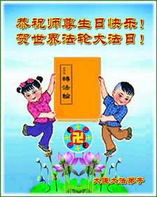甘肃省兰州新得法的大法弟子恭祝师尊生日快乐!恭贺世界法轮大法日!弟子感谢师尊慈悲救度!人人都想追求真理,但真理不是随便可得的,得付出,甚至巨大的付出,才配的上得到宇宙真理,换句话说,得是个与真理相配的生命!伟大慈悲的主佛,我们伟大至高至上的师尊,亲临人世间洪传宇宙大法,开天辟地的佛恩浩荡,能成为师尊的弟子并且在人间助师正法救度众生是何等的荣耀!请师尊放心,弟子决不负师命,弟子会倍加珍惜此刻的每一天,实修自己,履行责任,兑现誓约,跟师尊圆满的回家!跪拜师尊!合十!山东新得法的大法弟子恭祝师尊生日快乐!恭贺世界法轮大法日!弟子感恩师尊慈悲苦度洪恩!弟子有缘得到这万古难遇的宇宙大法,真是三生有幸!自从得法以后,弟子身心得到了天翻地覆、脱胎换骨的变化,不再追名逐利,人世间的一切,对弟子来讲都是过眼烟云,那种超然世外的轻松和愉悦是不修炼的常人永远也无法体会到的!师尊给予弟子的一切,弟子用人间的任何语言都无法描述!弟子唯有多学法,做好三件事,多救众生,让师尊多一分欣慰,少一分操劳,才能对得起师尊为弟子所做的一切!跪拜师尊!合十!山西省临汾市侯马市一对新学员夫妻大法弟子恭祝师父生日快乐!祝5.13法轮大法日!我们是2009年的新学员,一个在魔窟,一个在家,不管在哪,我们都会记住,我们是师父的弟子,主佛的弟子,在什么环境下都会做好三件事,争取和师父回家。
