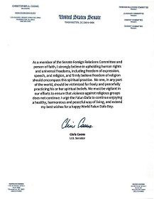 在二零一三年世界法轮大法日前夕,美国德拉华州联邦参议员克里斯托弗•昆斯给法轮功学员发来贺信,祝贺世界法轮大法日。
