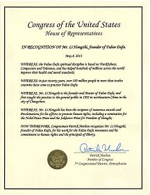 美国密苏里州温茨维尔市市长尼古拉斯﹒古奇昂二零一三年五月八日签署褒奖令,褒奖法轮大法,宣告二零一三年五月十三日为密苏里州温茨维尔市“法轮大法日”以颂扬“真、善、忍”。