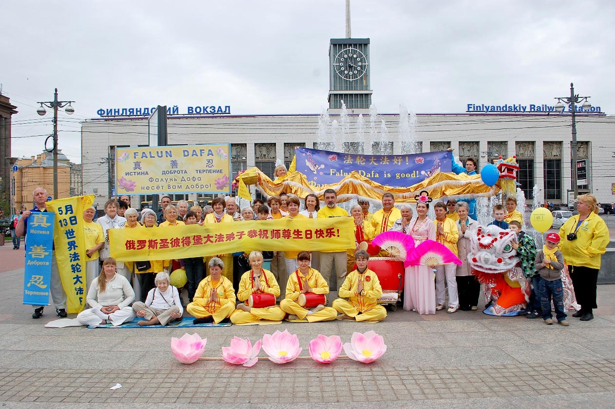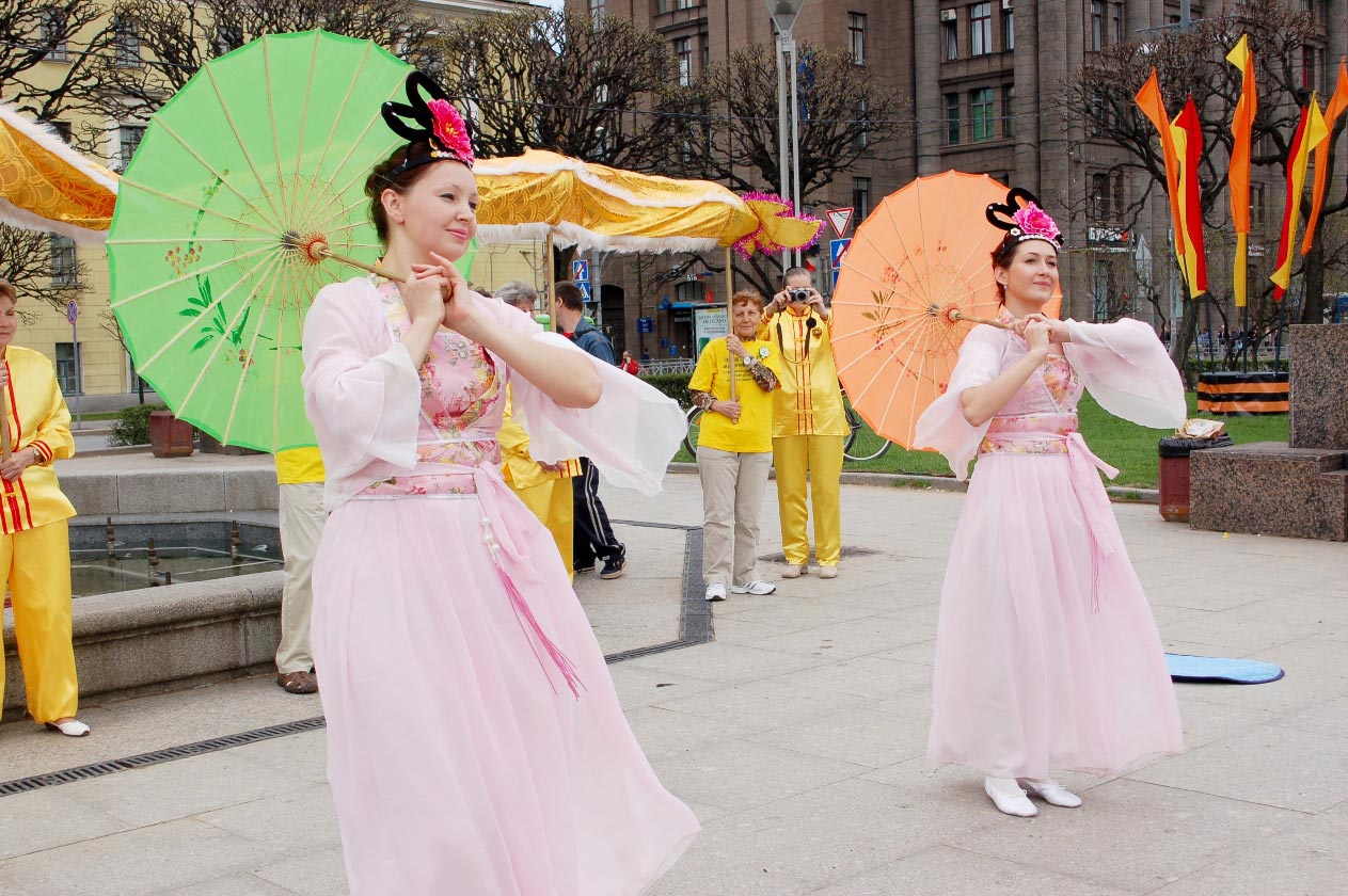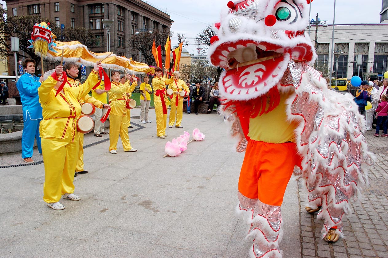 这一天风和日丽,广场上人流熙熙攘攘。学员们打起腰鼓、表演了舞龙、舞狮、中国传统舞蹈。学员们还在广场上摆上真相展板,向人们介绍法轮大法的美好,讲述发生在中国的迫害。