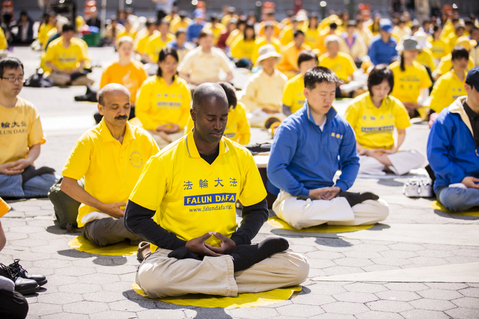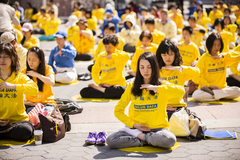 五月十二日纽约法轮功学员于纽约曼哈顿富利广场集体炼功