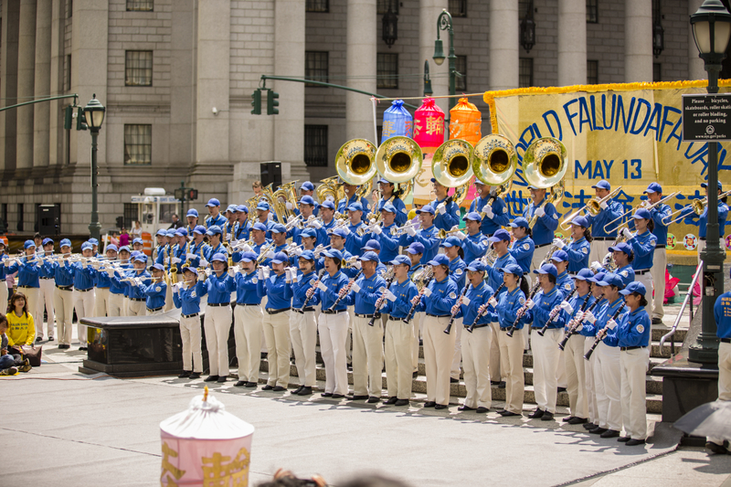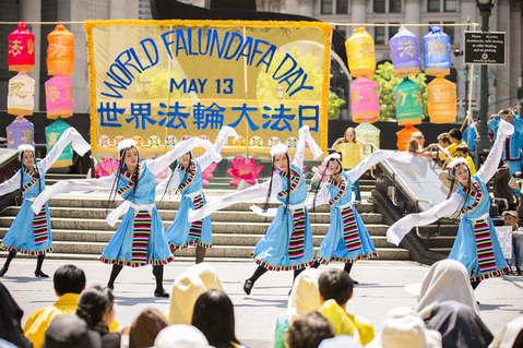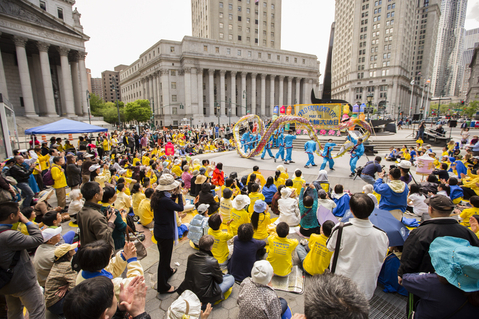 富利广场位于纽约市最高法院的前方,法轮大法在中国受到打压,却在美国的司法重地展现祥和与美好,令不少从中国大陆来的华人游客也大感惊奇。看到舞台上的美丽场景,他们不自觉的读出声来“五月十三日,世界法轮大法日”
