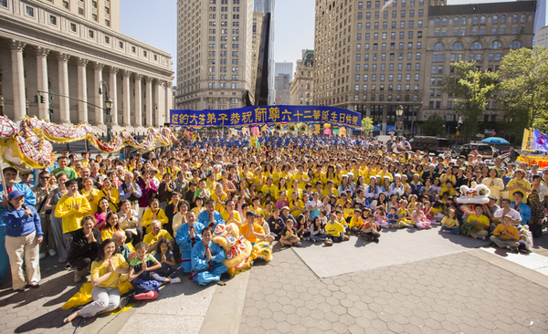 全体纽约大法弟子于纽约曼哈顿富利广场祝师尊生日快乐