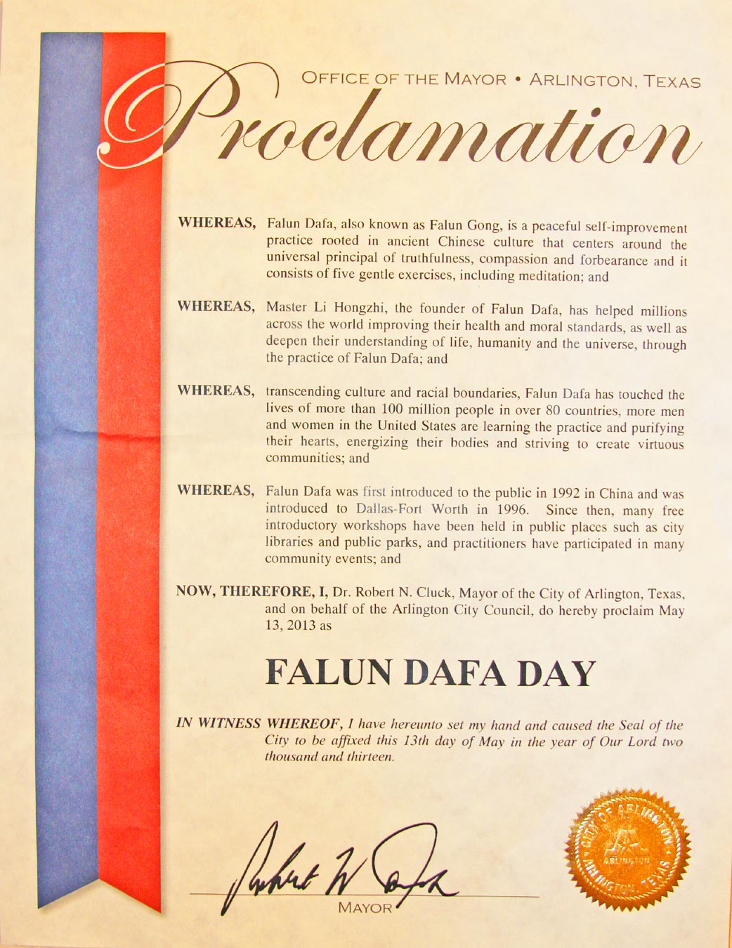 鉴此,我,罗伯特·克拉克,阿灵顿市市长,并代表市议会,宣布二零一三年五月十三日为