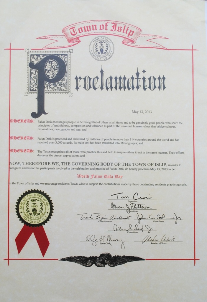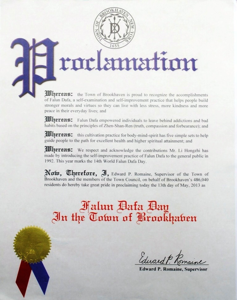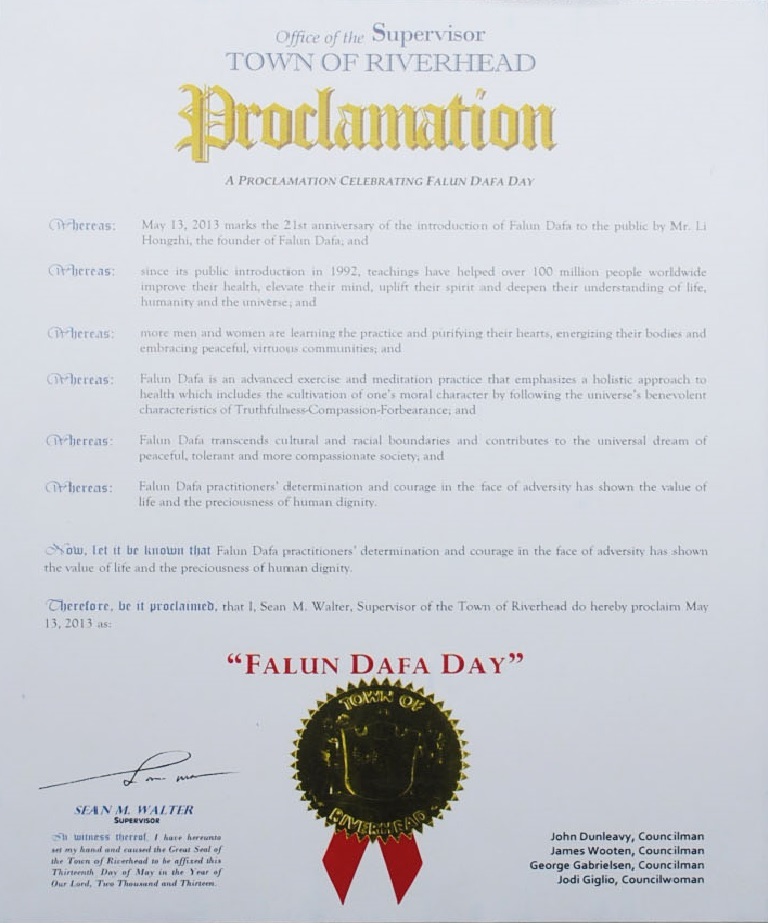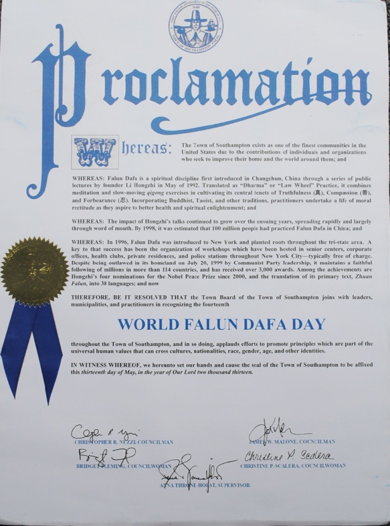 鉴于:法轮大法自一九九六年传入纽约,并在大纽约地区扎下了根。数以百计的修炼者在大纽约地区的老人中心,公司,健身房,私人住家和警察局等地方举办过免费的法轮大法介绍班。尽管中共在一九九九年七月二十日开始禁止法轮大法,法轮大法被世界上一百一十四个国家和地区的人们修炼和珍爱,并获得了三千多份褒奖。李洪志先生自二零零零年起曾四次被提名诺贝尔和平奖,并且主要著作,《转法轮》被翻译成三十八种文字;