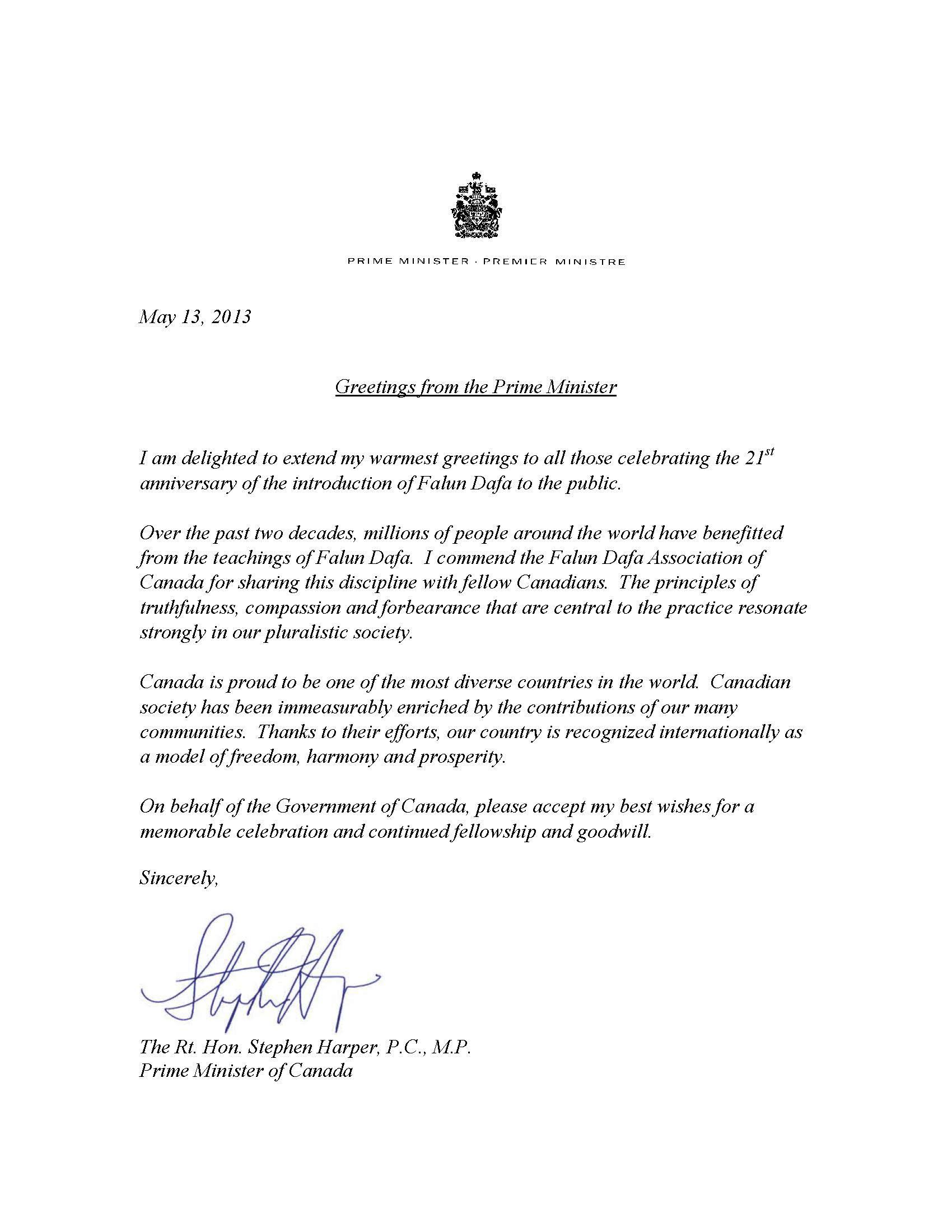 <英文版: http://en.minghui.org/html/articles/2013/5/19/140006.html>加拿大总理祝贺法轮大法传世二十一周年(图)